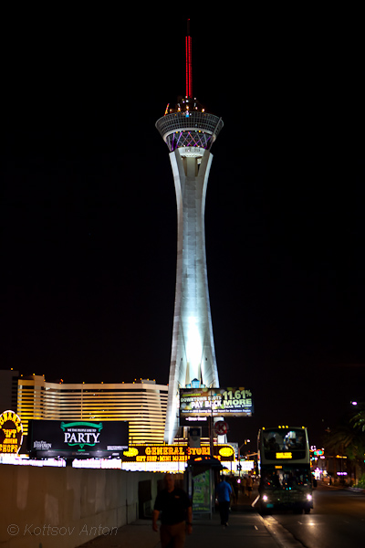 По прилету в аэропорту взяли заказанную заранее машину и поехали в город. Ну не совсем в город, так как жили мы на Стрипе, находящейся за пределами города вообще говоря. Медленно проехав по этой улице, на которой сосредоточены самые крупные, знаменитые и известные казино, заселились в свой отель — Стратосферу. Самое высокое казино Вегаса, с крыши которого можно совершить несамоубийственный прыжок.
