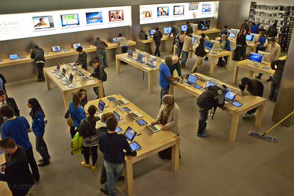 Чтобы попасть в сам магазин нужно спуститься под землю — по лестнице или в лифте. Внутри стоят столы со всей линейкой продукции фирмы и бегает куча сотрудников в синих рубашках, каждый из которых будет предлагать тебе помощь и спрашивать, как твои дела, пока не уморит. Некоторые из посетителей словно вышли из пародии на "Эппл-стор": ортодоксальные евреи, прижимающие к груди мешки с айпадами, замотанные в материю восточные женщины, подбирающие чехлы к своим новым айфонам, комичные американские леди в возрасте, терзающие различные модели макбуков...