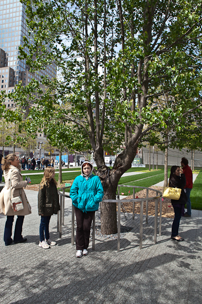 А вообще вся площадка засажена белыми дубами, пока молоденькими. Еще раз хочу отметить, что на Граунд Зеро действительно царит особая атмосфера торжественной скорби. Особенна она тем, что не создавалась искусственно — американцы так искренне скорбят по погибшим и так глубоко чтут их память, что у чувствительных особ вроде меня начинает щекотать в носу.