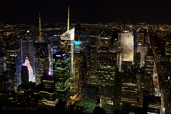 Скоростной лифт (а как иначе) домчал нас на смотровую площадку. И вот под нами — ночной Нью-Йорк. Самая интересная забава на Эмпайр — находить места в городе, где успел побывать. Справедливость ради хочу сказать, что город с высоты птичьего полета потрясает.