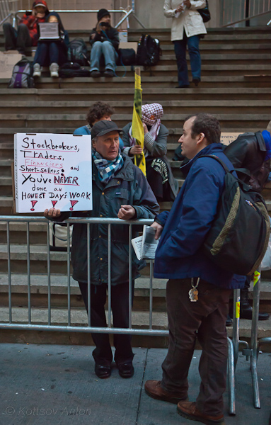 Но у меня с ним связаны профессиональные эмоции — когда больше 10 лет отслеживаешь биржевые новости, как то проникаешься духом. Да, видели демонстрантов! Тех самых, которые «оккупируй Уолл-Стрит». Как и во многих цивилизованных странах мира, где есть отгороженные спецместа для выражения протестов, им выделили закуток на ступенях Федерального зала (там Дж. Вашингтон принес присягу как первый президент США и рядом стоит его красивый памятник). Демонстранты огорожены забором, сидят чисто как в зоопарке. Лозунги из разряда «Финансисты и прочие, вы никогда не пахали по- настоящему!» написаны на коробках из-под пиццы.