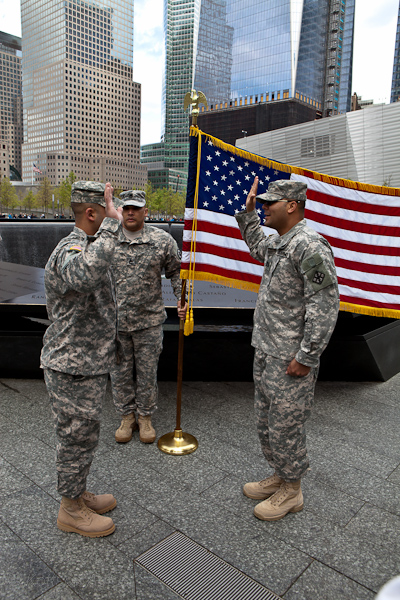 Идея мемориала, на мой взгляд, великолепна — бассейны не наполнены водой, она стекает по их стенкам, подобно слезам. Никакого пафоса, и в то же время - колоссальная эмоция. Аллегория скорби, ни много-ни мало. По бронзовому периметру бассейнов нанесены имена погибших. Неподалеку мы увидели кучку морпехов с неизменным звезднополосатым флагом, которые жали друг другу руки. Непонятно, было это частью некоего посвящения (например), или они ходят там постоянно. Но именно они были основным предметом фотосессии у всех посетителей.