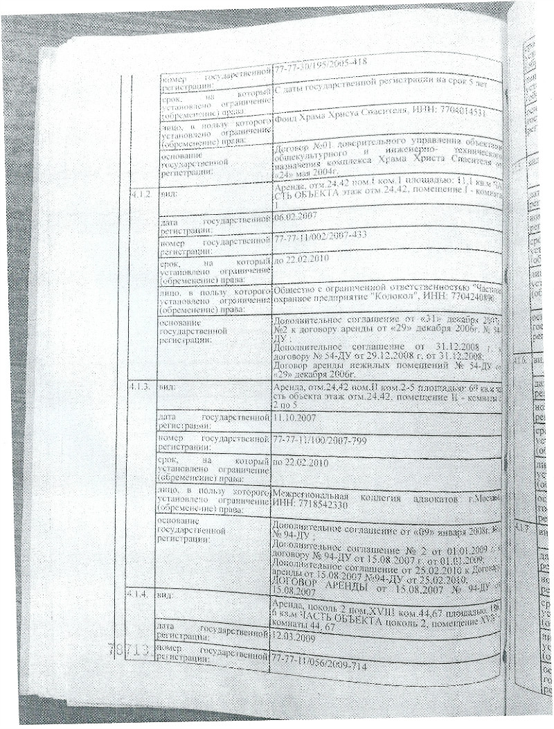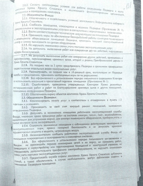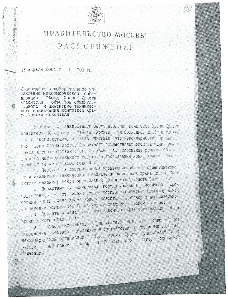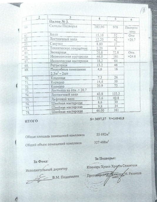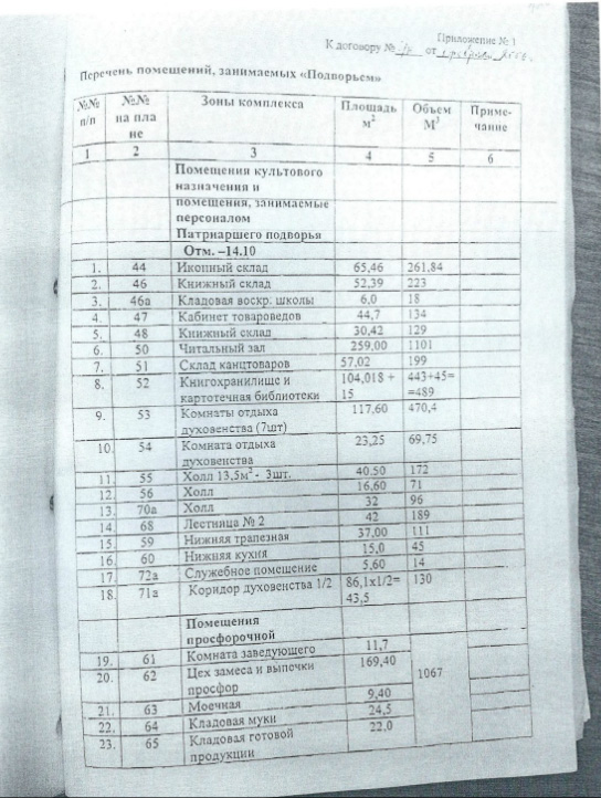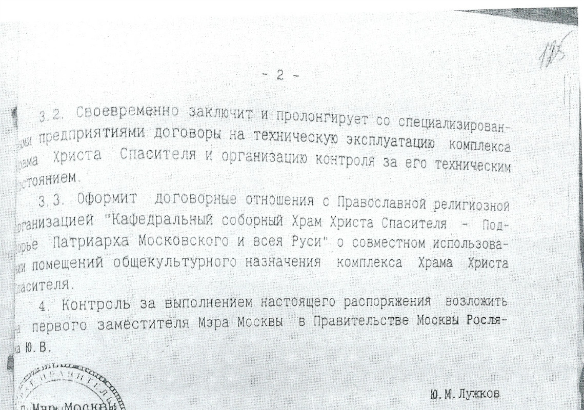 Согласно распоряжению мэра Москвы № 703-РП от 15.04.2004 года Фонду Храма Христа Спасителя передано в доверительное управление помещение храма общей площадью 55692 кв. метра для использования в соотвествии с уставными задачами некоммерческой организации. Это же постановление предписывает Фонду заключить договор о совместном использовании помещений Храма с Подворьем Патриарха Московского и Всея Руси. Как следует из договора о совместном использовании помещений от 01.02.2006, заключенным между Фондом Храма Христа Спасителя и Подворьем Патриарха Московского и Всея Руси, в пользование Подворью передано всего 78 комнат общей площадью 3697,27 кв. метров, то есть менее 7% общей площади храма. Среди них: кабинеты бухгалтерии, серверная, санузлы, шаферская, трапезная, умывальня, душевая, магазин «Книжная лавка» и магазин «Иконная лавка», подсобки, кладовки и другие комнаты. Помещение Верхнего храма, где 21 февраля 2012 года состоялось выступление панк-группы Pussy Riot Подворью Патриарха Московского и Всея Руси никогда официально не передавалсь. Это обстоятельство также подтверждается выпиской из единого государственного реестра прав на недвижимое имущество и сделок с ним № 05/017/2012-576 от 18.06.2012, согласно которой помещение Верхнего храма находится в собственности города Москвы и в доверительном управлении Фонда Храма Христа Спасителя. Ограничения или обременения права на помещение Верхнего храма Управлением Росреестра по Москве не зарегистрировано.