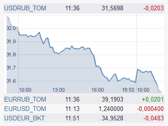 Средневзвешенный курс доллара США к российскому рублю со сроком расчетов "завтра" на торгах единой торговой сессии межбанковских валютных бирж по состоянию на 11:30 по московскому времени, на основе которого происходит процесс курсообразования доллара на следующий день, упал на 28,07 копейки и составил 31,6644 рубля, передает "Финмаркет".