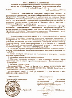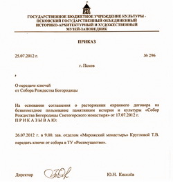 Завершение июля было ознаменовано еще одним крупным скандалом в сфере псковского культурного наследия. Причем скандалом не только регионального и российского, но – мирового уровня. 25 июля стало известно о состоявшемся 17 июля 2012 года расторжении охранного договора на безвозмездное пользование памятником истории и культуры «Собор Рождества Богородицы Снетогорского монастыря» от 5 ноября 2011 года № 207. Соглашение о расторжении договора на пользование объектом культурного наследия федерального значения уместилось на одном листе. Его подписали руководитель территориального управления Росимущества в Псковской области Александр Сребролюбов и директор Псковского музея-заповедника Юрий Киселев. Единственный в своем роде памятник культуры федерального значения планируется передать местной религиозной организации Снетогорского монастыря для использования в уставных (богослужебных) целях.