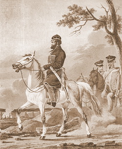 Прижизненные портреты Александра Чеченского неизвестны. Но есть картина Орловского 1814 года и гравюра Дюбурга, сделанная на основе этой картины. На переднем плане на коне – Денис Давыдов. За его спиной в отдалении – два всадника. Принято считать, что один из них – Александр Чеченский. И он не похож на человека, изображенного на памятнике в Бежаницах.