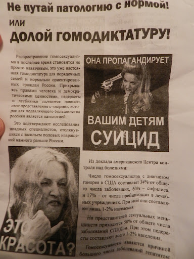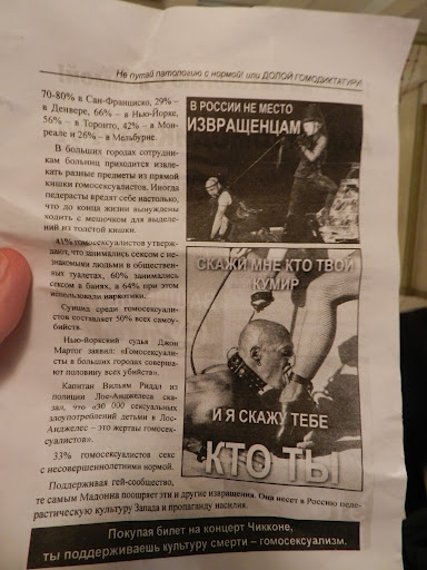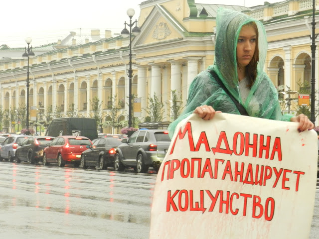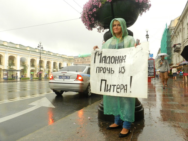 ВПетербурге завершилась череда одиночных пикетов против Мадонны. "Профсоюз граждан России" и "Народный собор" заявили, что сегодня, с 18.00 до 19.00, не менее 50 активистов выйдут на Невский проспект с плакатами и листовками, дабы выразить свое возмущение позицией Мадонны относительно защиты ЛГБТ и группы Pussy Riot. "Граждане России" также недовольны эпатажными выступлениями певицы, полными сцен насилия и оружия. Однако из-за проливного дождя на Невском этим вечером пикетировало от силы десять человек, да и сами пикеты быстро свернулись. Зато успели рассказать о том, что гомосексуалисты - основными переносчики гонореи, сифилиса и суицида.