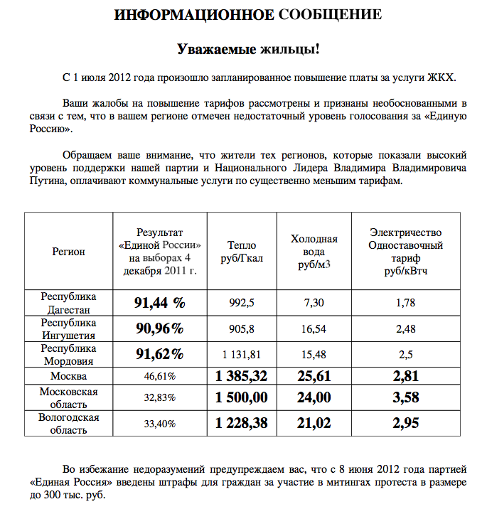 Проверка показала, что размещенный в электронном виде в сети Интернет макет листовки содержит заведомо ложные сведения об организации её издавшей и о взаимосвязи показателей роста тарифов в сфере ЖКХ в отдельных регионах от показателей числа голосов, полученных партией «Единая Россия» на выборах в Государственную Думу Федерального Собрания Российской Федерации.
