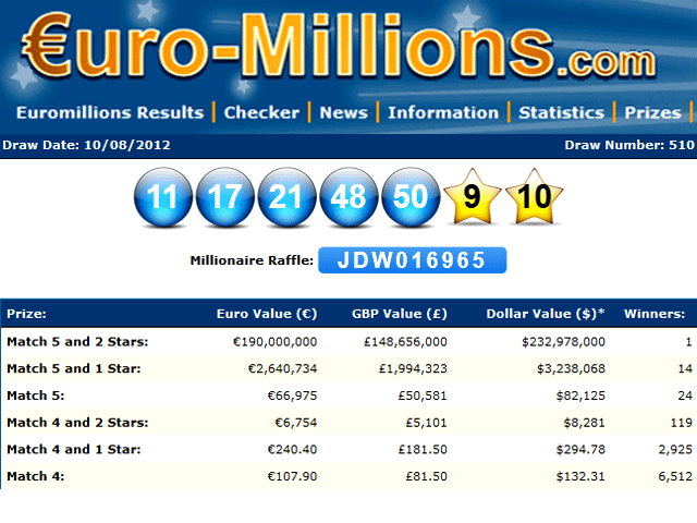Розыгрыш прошел вечером в пятницу. В нем могли принять участие жители Франции, Великобритании, Испании, Бельгии, Швейцарии, Португалии, Австрии, Ирландии и Люксембурга. Чтобы стать миллионером, нужно было отгадать семь номеров - пять цифр и две "звездочки".