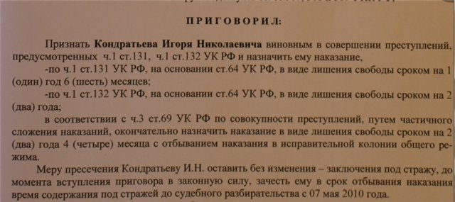 Внимание! По двум эпизодам в совокупности: изнасилование и насильственные действия сексуального характера в отношении несовершеннолетней наш супер гуманный суд назначил Крестову-Кондратьеву меру пресечения в виде… тадам ! Двух лет и 4 месяцев лишения свободы!!!