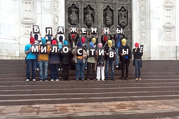 У храма Христа Спасителя прошла акция в защиту Pussy Riot. Утром 15 августа активисты в разноцветных балаклавах выстроились в ряд у здания храма с табличками, образующими надпись "Блаженны милостивые".