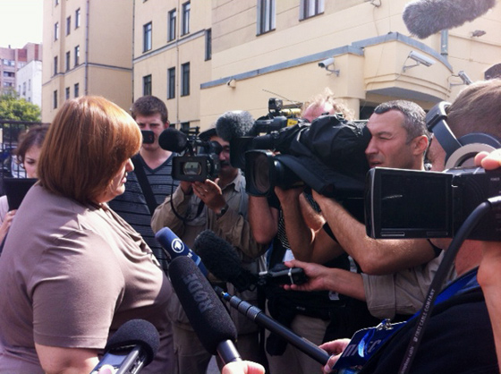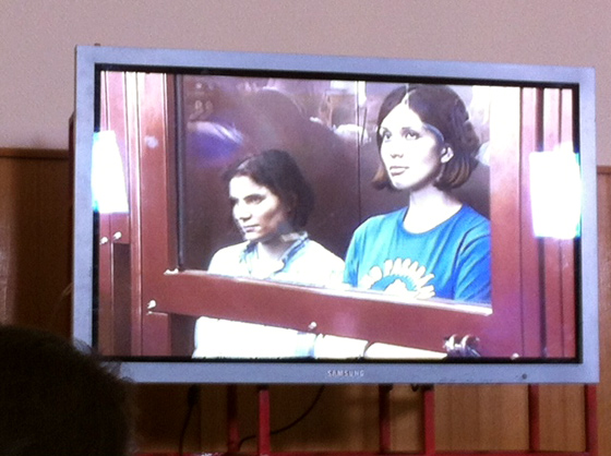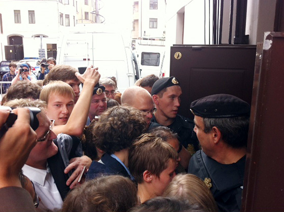 18.33. Жалин. Девушек вроде бы увезли. Люди из соседнего с судом дома вышли на балконы, хлопают в ладоши и кричат «Свободу Pussy Riot!». Очень много иностранных репортеров.