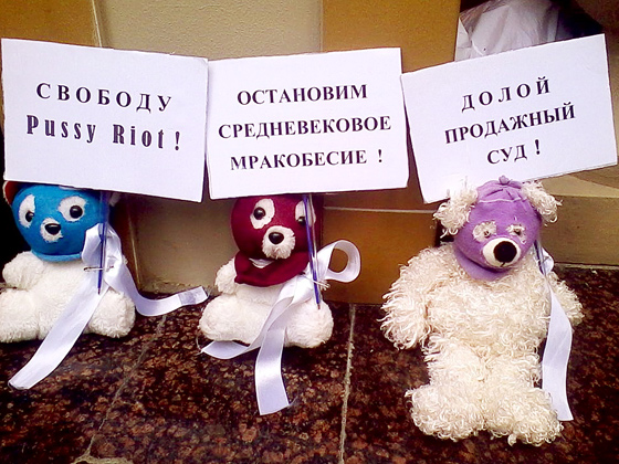 17.25. Лизер. Люди общаются, читают твиттеры из суда, читают в том числе вслух. На столбе с камерой видеонаблюдения висит фиолетовый шарф. Люди едят принесенную с собой еду. На окно дома 11 в Ростовском переулке кто-то наклеил большую наклейку «Свободу Pussy Riot!». В толпе виднеются игрушки, на головах у них маленькие балаклавы.