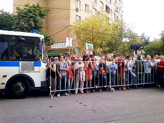 14.10. Лизер. У суда – несколько сотен человек. Продолжают подходить. Говорят, уже задержали двоих или троих. Пришел Удальцов. Полиция постоянно кричит: «Уважаемые граждане, покиньте проезжую часть!»