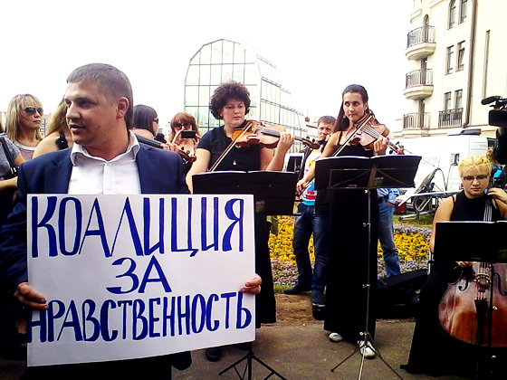 14.55. Лизер. В переулке играют три скрипачки и виолончелистка. Перед ними стоит мужчина с плакатом «Коалиция за нравственность». Полиция их не трогает.