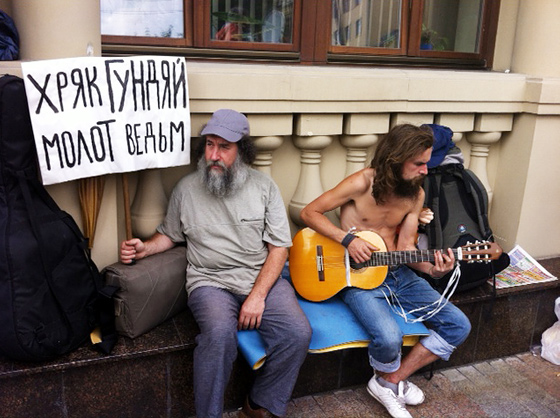 14.45. Лизер. Толпа ультраправых с неприятными лицами скандирует: «Едем на костер!». У них в руках плакаты: «Плясала на святом амвоне – попляши теперь на зоне», «Ведьм на костер», «Надька, не балуй», «Бабий бунт не пройдет!»