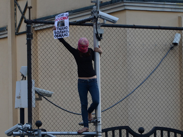 Активистка Татьяна Романова в лиловой балаклаве на голове вначале залезла на фонарный столб у турецкой дипмиссии, расположенной напротив здания суда и скандировала лозунги в поддержку приговоренных девушек, сообщает Газета.Ru.