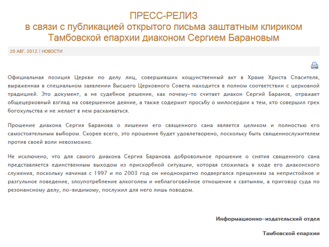 "Не исключено, что для самого диакона Сергия Баранова добровольное прошение о снятии священного сана представляется единственным выходом из прискорбной ситуации, которая сложилась в ходе его диаконского служения, поскольку начиная с 1997 и по 2003 год он неоднократно подвергался прещениям (церковное дисциплинарное наказание - прим. ред.) за непристойное и разгульное поведение, злоупотребление алкоголем и неблагоговейное отношение к святыням, а приговор суда по резонансному делу, по-видимому, послужил для него лишь поводом", - отмечает Тамбовская епархия.