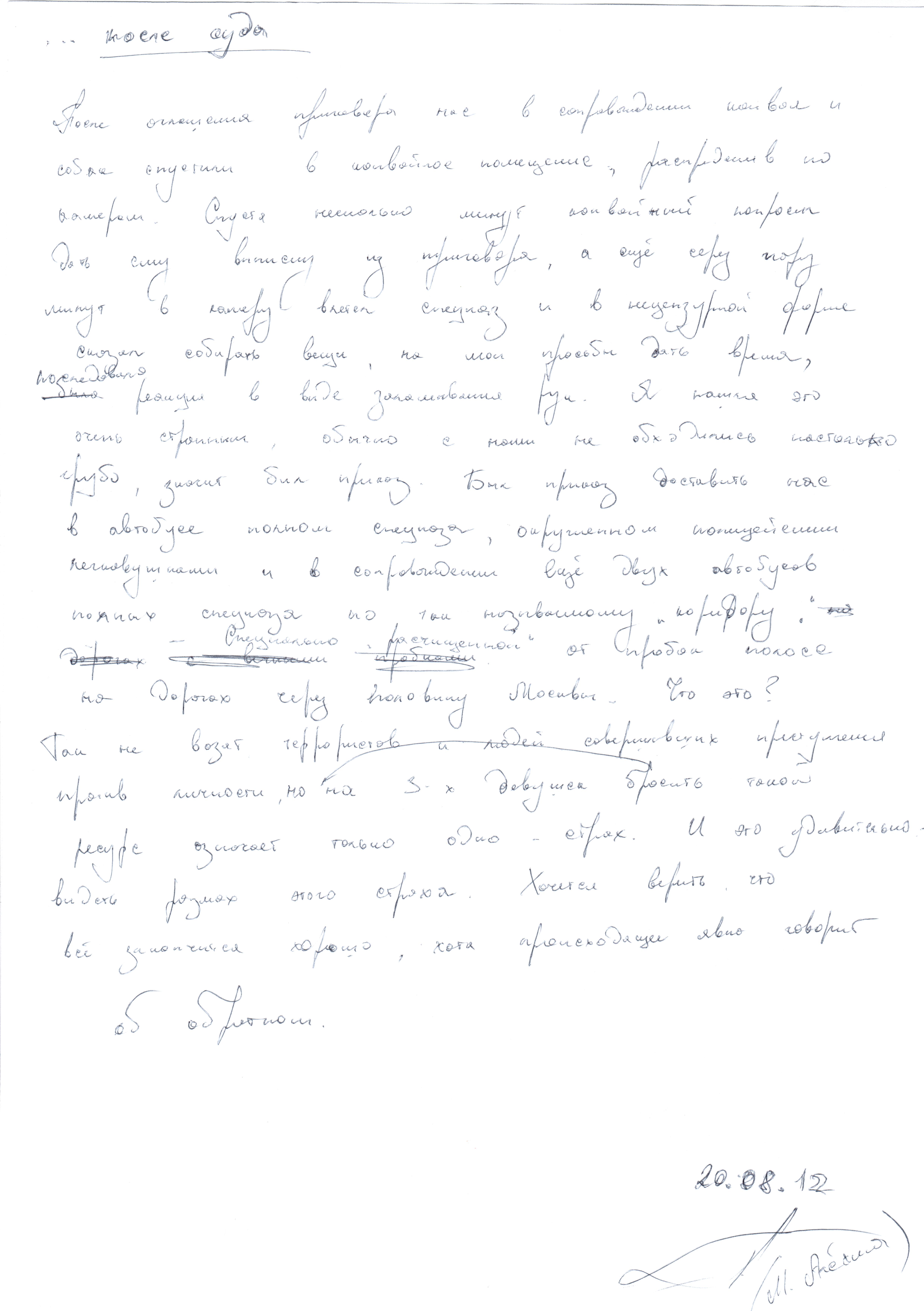 Ниже привожу письмо Марии Алехиной о событиях, которые произошли сразу после вынесения Хамовническим судом приговора 17.08.2012г.