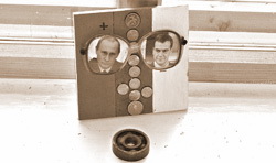 Иногда форму креста приобретают сложенные определенным образом бумажные купюры – доллары. Иногда бумажные купюры сменяются монетами. У одного креста, того что на окне, вместо одной из перекладин – оправа очков. В правом стекле портрет Путина, в левом – Медведева.