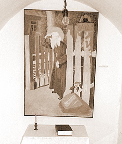 На одну из картин попал старец Николай Гурьянов. Выглядит он вполне реалистично. Всматривается вдаль. Если мысленно продлить его взгляд, то он как раз и упрется в ту самую стенку, в которой «замурованы» большевистские листовки.