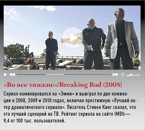 «Во все тяжкие»/Breaking Bad (США, канал AMC, 2008). Это опять сериал в жанре нуар — об учителе химии, который заболевает раком и понимает, что, кроме долгов, ничего не оставит семье. Поэтому он принимает решение не лечиться и занимается производством наркотиков. Парадокс и привлекательность его личности в том, что он, с одной стороны, наивный и в самом начале чертовски неумелый и невезучий драгдилер, но при этом умный, с отличной реакцией хладнокровный человек, который спокойно принимает решение растворить в ванной несколько трупов. В напарники он берет своего бывшего ученика, который известен как мелкий дилер метамфетамина, и вместе они вляпываются в неприятности одна за другой.