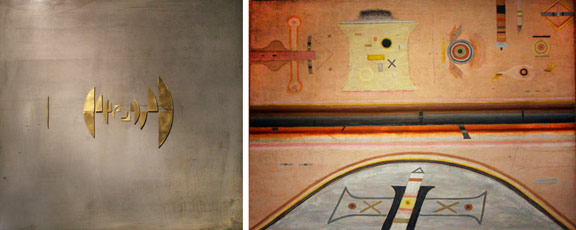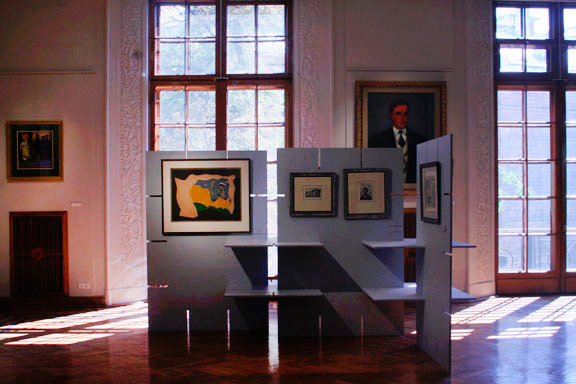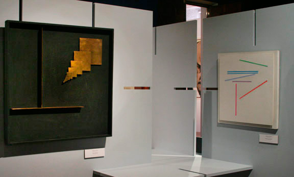 Тадуеш Шпунар, "Композиция", 1960; Владимир Янкилевский, "Без названия, 1983". Коллекция Петра Новицкого. Работа с контекстом в проекте Новицкого – не только в выборе экспонатов, она продолжается в архитектуре экспозиции и в оформлении каталога. Здание музея декоративно-прикладного и народного искусства - старинная русская усадьба со сталинскими интерьерами, оставшимися от времен, когда здесь был Совет министров РСФСР. Хотя Новицкий привез всего одну десятую часть своей огромной коллекции, стен все равно не хватало. Были выстроены оригинальные стенды с прорезями и сложно пересекающимися поверхностями. Мы бы восприняли их как должное на какой-нибудь международной выставке дизайна. Но здесь, на фоне лепнины с колосьями, золоченых решеток с пятиконечными звездами, массивных деревянных дверей с резьбой – эти стенды выглядят как вызов, снова как эстетический прорыв через тоталитарную идеологию.