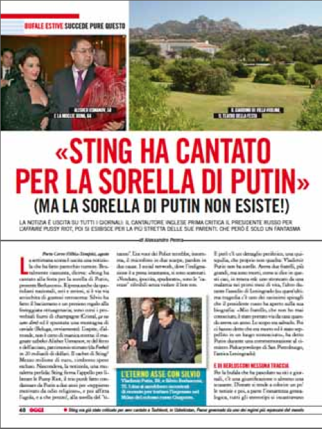 Итальянские журналисты провели расследование и выяснили, что Стинг действительно приезжал в Италию, чтобы выступить на дне рождения, но только не мифической путинской сестры, а на дне рождения Ирины Винер, тренерши Алины Кабаевой и бывшего доверенного лица Путина на прошлых президентских выборах. Ирина Александровна — супруга миллиардера Алишера Усманова, известного в некоторых кругах по кличке Узбек, и неустанная пропагандистка учения каббалы.