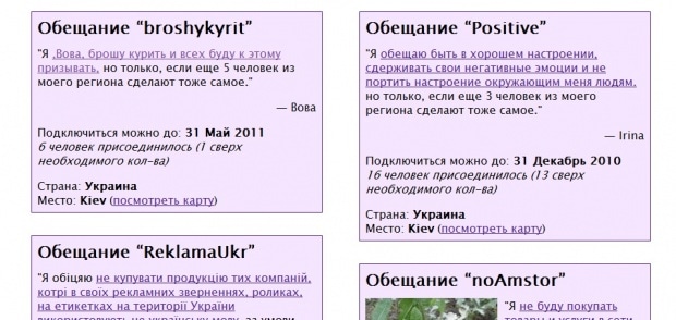Обещания не становятся успешными, просто находясь на сайте. Каждой инициативе нужна поддержка и продвижение. Обещание не попадет в поле зрения обычных посетителей сайта до тех пор, пока его не поддержит несколько единомышленников, у которых хватит времени и терпения отыскать сообщение среди прочих.