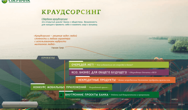 Слова Президента Сбербанка Германа Грефа о многообразии сфер применения краудсорсинга, процитированные на главной странице сайта, подтверждаются широтой заявленных для обсуждения тем. Сбербанк предлагает аудитории включиться в обсуждение популярных некредитных продуктов, предложить решения по уменьшению очередей и выссказаться на тему инновационной политики организации.