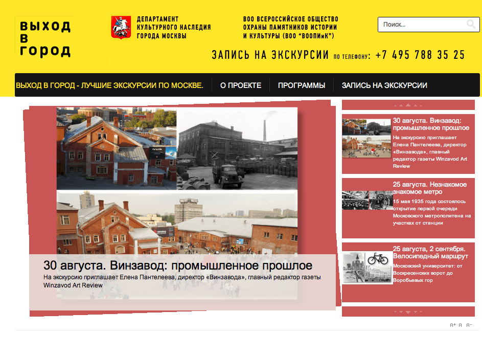 Департамент культурного наследия города Москвы запустил Интернет-ресурс «Выход в город» осенью 2011 года. На сайте проекта размещена информация о бесплатных экскурсиях, в которых поучаствовали более 20 000 людей.