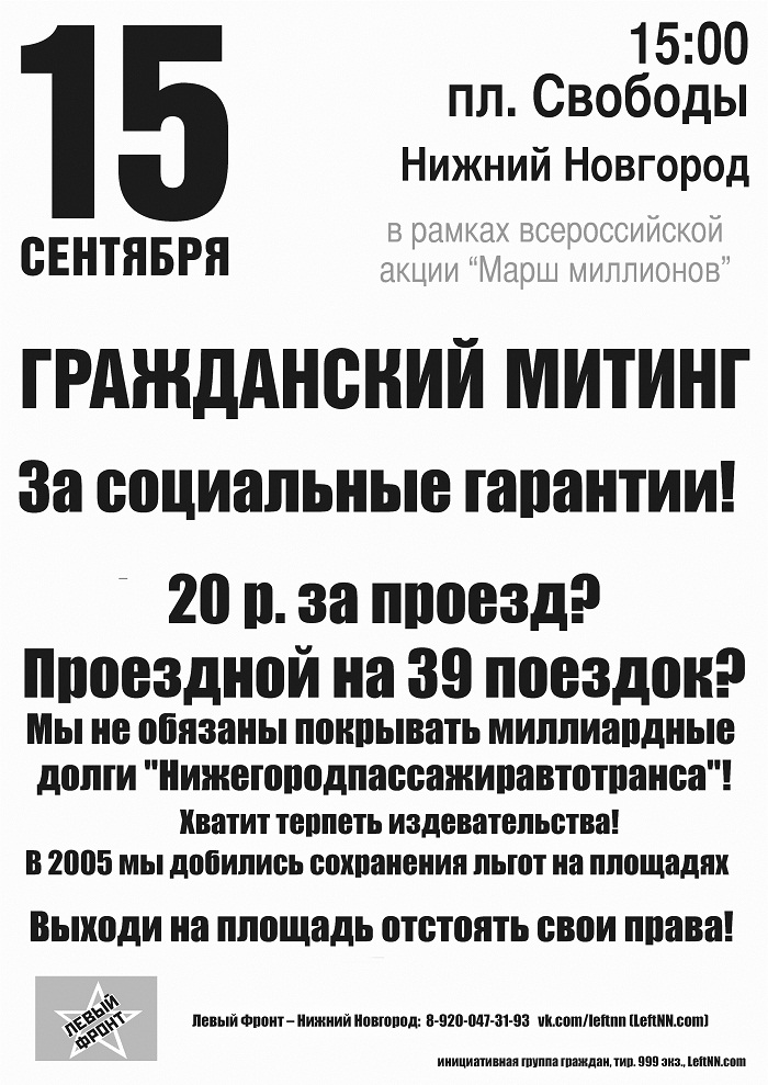 Между тем, отрадно, что фактически нижегородские оппозиционные силы поддержали идею выдвижения на предстоящей протестной акции 15 сентября социально-экономических требований. И тема борьбы за дешёвый проезд также заявлена как одна из основных на мероприятии. Оперативно были составлены листовки, которые раздавались возле киосков, где продаются проездные билеты.