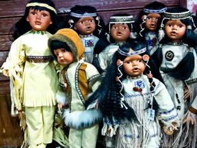 Наше внимание привлек прилавок с куклами ручной работы, довольно большими, в до мелочей выполненных сложных нарядах, застывшими в «видимо истинно индейских» позах.