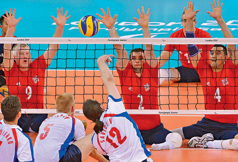 Матч между командами России (белая форма) и Великобритании в турнире по сидячему волейболу