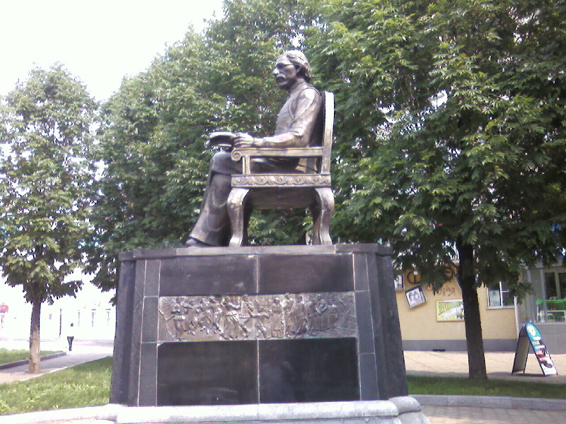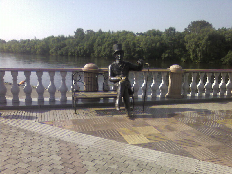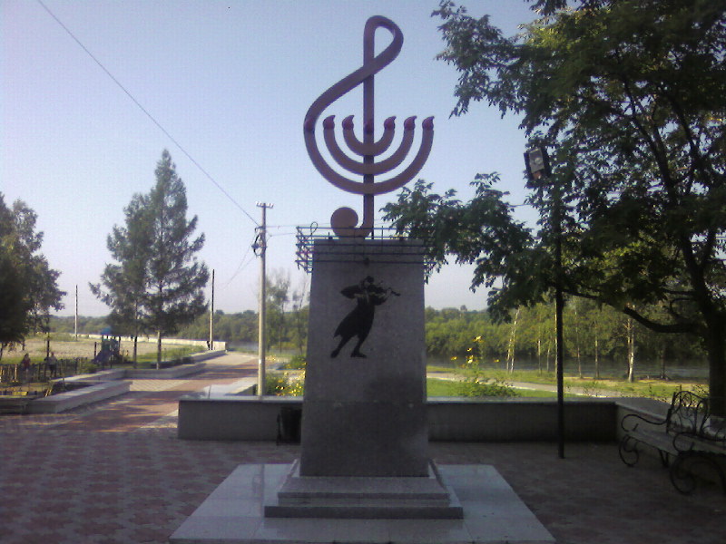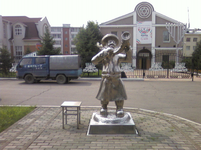 Биробиджан – город памятников. На набережной реки Биры вдруг видишь беседку XIX века, а рядом на скамейке - человека в цилиндре и с тростью. Вроде бы Пушкин, но нет, не он. "Евгений Онегин", - разъяснили мне в пресс-службе губернатора. А на " Арбате" сидит в кресле и наблюдает за суетой в недавно выстроенных торговых центрах Шолом-Алейхем. Веселый человек трубит в рог перед зданием Биробиджанской еврейской общины.
