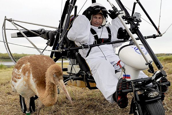 Фото: Reuters Владимир Путин ненадолго стал вожаком стаи редких журавлей. Президент нарядился в специальный костюм и поднялся на дельтаплане со стаей стерхов под Салехардом на Ямале.