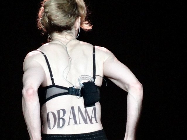 На своем концерте в Нью-Йорке, который проходил одновременно со съездом Демократической партии, Мадонна сняла блузку и показала своим фанатам тату на спине с надписью «OBAMA».