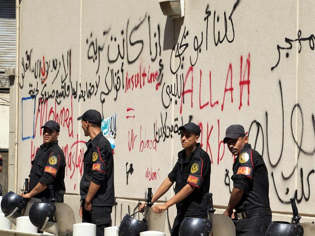 Относительно мирная демонстрация переросла в беспорядки, когда десятки человек вскарабкались на бетонные стены хорошо укрепленного посольства в центре египетской столицы. Несколько человек перелезли через ограду дипмиссии, сорвали американский флаг, в клочья разодрали и водрузили вместо него черное полотнище с надписью на арабском языке: "Нет бога, кроме Аллаха, и Мухаммед - пророк его".