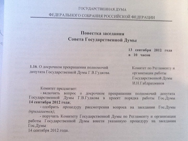 Ранее Геннадий Гудков опубликовал в своем блоге повестку дня Госдумы. В документе указывается, что Ильдар Габдрахманов предложил включить на 14 сентября голосование по досрочному лишению Гудкова депутатских обязанностей. «Ну, появилась ясность, когда меня турнут из ГД. К 15.09. успевают. Готовят аресты?» — написал в своем микроблоге Twitter Гудков.
