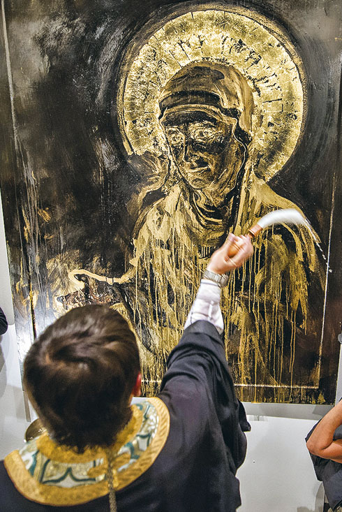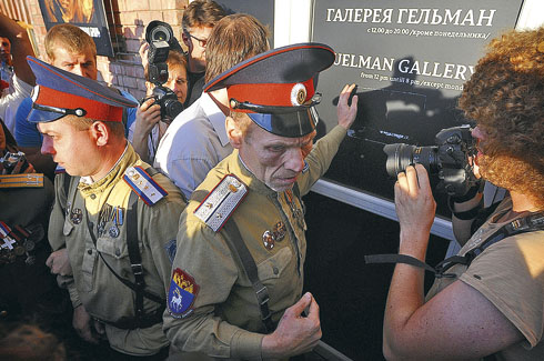 Со скандала началось открытие выставки «Духовная брань» в галерее Марата Гельмана на «Винзаводе». Вход в галерею заблокировали несколько десятков казаков и православных активистов, недовольных тем, что на картинах изображены святые в балаклавах, а участницы группы Pussy Riot — c нимбами.