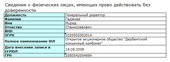Открываем ЕГРЮЛ и обнаруживаем, что г-н Гаджиев не только акционер, но и генеральный директор ОАО «Дербентский коньячный комбинат» с 18 августа 2008 года.