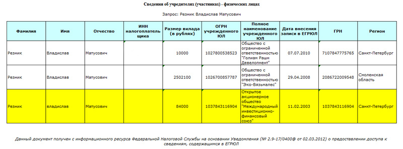 По данным нашей любимой ЕГРЮЛ, г-н Резник также является учредителем ОАО «Международный инвестиционно-финансовый союз». В декларации это предприятие не указано!