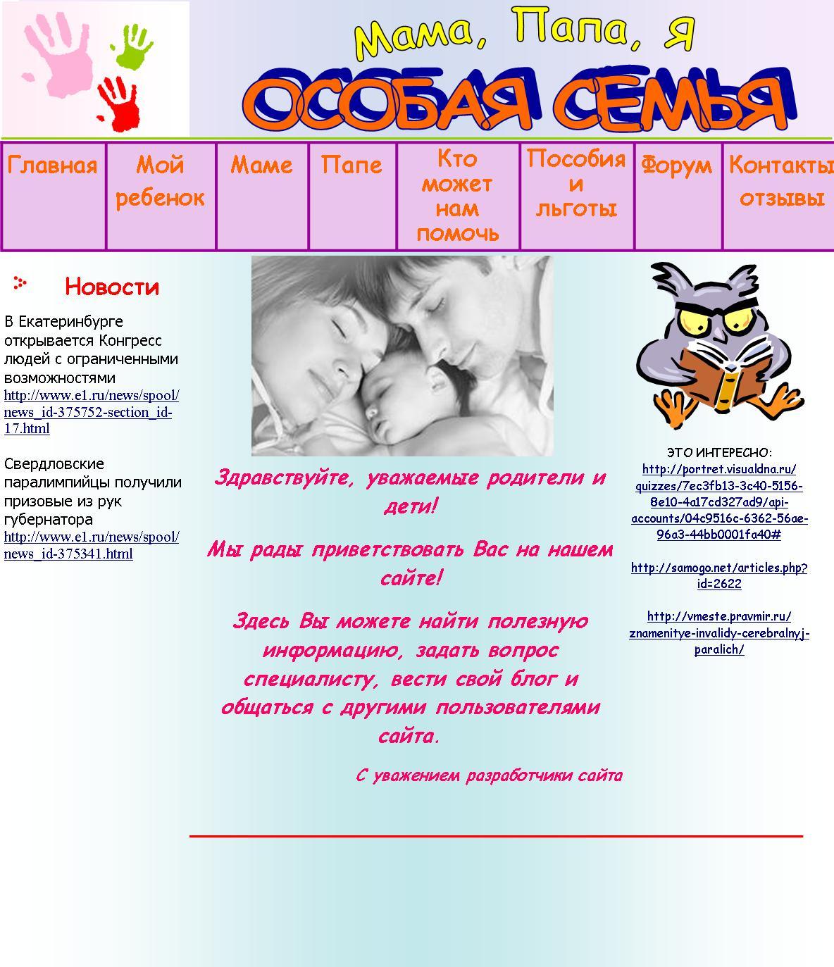 - раздел «Папе» содержит информацию о важности отца для своей семьи, истории знаменитых отцов с особыми детьми.