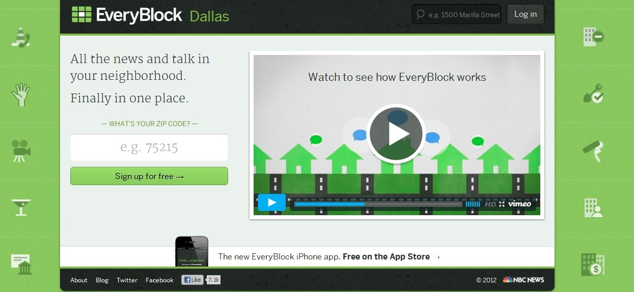 Небольшая группа разработчиков из Чикаго предложила свой вариант решения этой проблемы – экспериментальный сервис Everyblock, своеобразную информационно-социальную сеть, целевую аудиторию которой составляют жители одного микросообщества. С помощью данного сайта пользователи получат возможность узнавать самые свежие и проверенные новости о жизни своего района и существенно расширить круг местных знакомств, ограничивающийся до этого момента соседями по лестничной клетке.