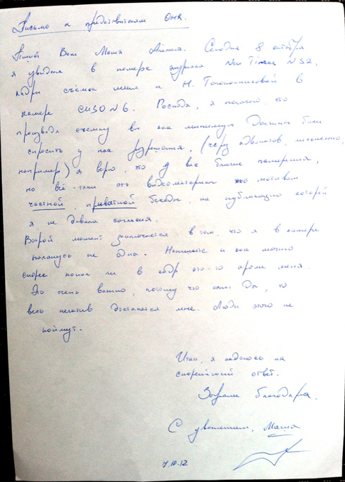 Пишет Вам Маша Алёхина. Сегодня 8 октября я увидела в номере журнала New Times № 52, кадры съемок меня и Н. Толоконниковой в камере СИЗО №6. Господа, я полагаю, что производя съемку вы как минимум должны были спросить у нас разрешения, (через адвокатов, письменно, например) я верю, что у вас благие намерения, но всё-таки это видеоматериалы по мотивам частной, приватной беседы, на публикацию которой я не давала согласия.