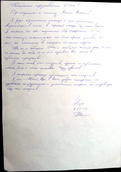 Я, как и Маша, верю в ваши добрые намерения, но удивлена непрозрачностью и умолчанием, которыми был сопровожден сбор этих материалов. Надя. 8.10.12