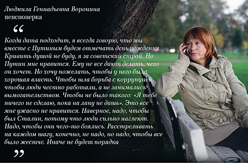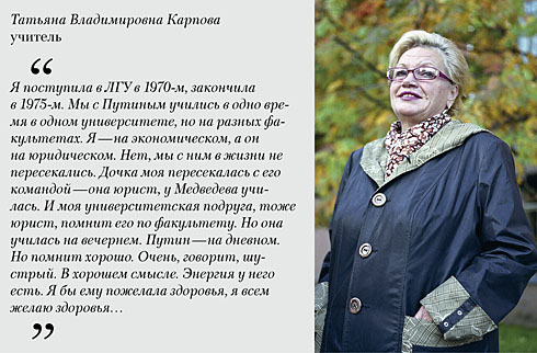 Учитель, работающий с полной нагрузкой, получает сейчас 18 тыс. рублей, говорит Карпова. Поклонница симфонической музыки, она накануне дня рождения мечтает о подарке — поездке в Вену, в оперу. «Будет семейный обед, а потом дочка скажет: «Не волнуйся, мы тебя отправим...» Не прямо сейчас, когда-нибудь». Дочь Татьяны Владимировны — судья. «Мне приятно, что юбилеи у нас в один день, да, почему нет». Президента интеллигентная петербурженка считает человеком образованным и скромным: она голосовала за него трижды и о выборе не жалеет: «Затруднения только в нас, глобально все правильно делается. Я, например, сторонница тех дел, которые сейчас совершаются. Вот очень многие говорят: «Олимпиада. Зачем?» А я считаю, что это надо делать, это действительно для страны нужно. Я не против Путина. Мне он симпатичен как человек. Тандем, конечно… Вот эти игры — они естественны, но не очень приятны. Люди же все понимают. А с другой стороны, по-другому — вообще непонятно как. Здесь — понятно как. Не очень красиво, но понятно. Ты можешь знать, чего ожидать».