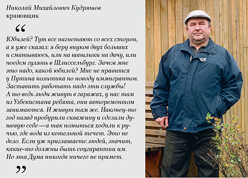 Единство места и времени. 7 октября уроженец Ленинграда Владимир Владимирович Путин отметил свой 60-летний юбилей. По заверению его пресс-секретаря Дмитрия Пескова, праздник был скромным: в кругу близких, в родном городе. Правда, о массовых акциях прокремлевских молодежных движений, прошедших в этот день по всей стране, пресс-секретарь умолчал — равно как и о том, что в Петербурге для организации торжеств был учрежден специальный орган под названием «Национальный комитет-60», а, например, в школы Таганрога накануне значимой даты поступило распоряжение: сдать по 100 детских рисунков, воспевающих юбиляра, для «отправки посылки В.В. Путину». На фоне этого «скромного, отмечаемого в исключительно узком кругу праздника» The New Times встретился с пятью простыми петербуржцами, которые также появились на свет 7 октября 1952 года, и предложил им рассказать о себе и своем отношении к августейшему ровеснику и земляку, а заодно передать ему поздравления и пожелания