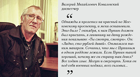 «Я ни в 1991-м, ни в 1993-м ни на какие демонстрации не ходил. Не мог понять, кто кого там давит. Руцкой этот башню захватывает, этот на танке пляшет — Ельцин, чокнутый алкаш, — вспоминает Ковалевский. — Ходил я только на последние выборы, голосовал за Жириновского. Владимир Вольфович мне нравится, он грамотный мужик, это тебе не Путин». В комнате диспетчера постоянно звонит телефон, и он заносит в тетрадь чьи-то фамилии.