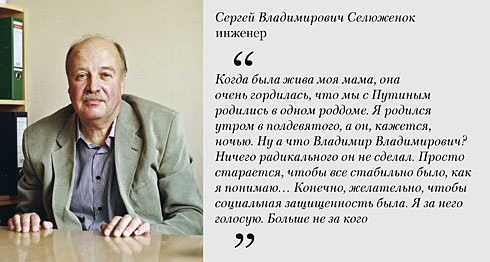 Нынешний инженер ФГУП «Охрана» 29 лет проработал во Всероссийском научно-исследовательском институте метрологии им. Менделеева, где тоже занимался ремонтом оборудования, правда, не сигнализаций, а высокопрецезионной техники особой точности. Но в девяностые зарплату в институте стали платить с перебоями, и он ушел. «Мне социализм нравился. Я от предприятия в 1980-х выезжал — в Болгарию, Польшу, ГДР. Страна была мощная, везде уважали, куда бы ни приехал. А сейчас я не понимаю, как к нам относятся. Надо было империю оставить», — ностальгирует Селюженок. В КПСС он, впрочем, никогда не состоял, а в семейной библиотеке, которой Сергей Владимирович нескрываемо гордится, водился даже самиздат. «Но от больших книг устаешь. «Архипелаг ГУЛАГ», например, не скажу, что сильное произведение. «Мастер и Маргарита» — то же самое. Я больше всего любил детективы, а сейчас только журналы читаю». На третий срок президента его ровесник возлагает определенные надежды: «Конечно, это будет похоже на Советский Союз. Но это понятно: Путин сам родился в Советском Союзе. Он почти коммунист, вы же помните, где он служил?» Про протесты оппозиции Сергей Владимирович знает немногое: «Ну что там эта Собчак? У нас к ней отношение не очень. Навальный? Я не знаю, кто это. Про Удальцова тоже не слышал. Я вообще этим всем не слишком интересуюсь». На вопросе, хотел бы он что-нибудь пожелать президенту, Селюженок впервые смущается: «Наверное, долгих лет жизни, здоровья, процветания, любви, признания, счастья в личной жизни. Для меня это важно — для него, наверное, тоже».